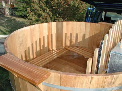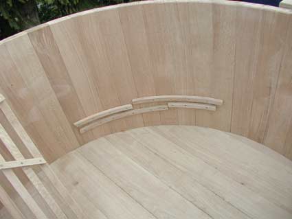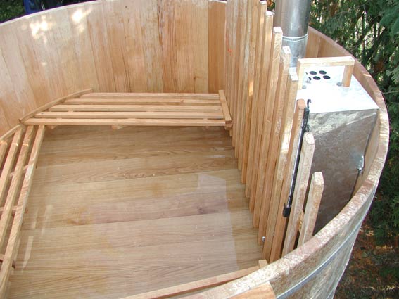 Blick über den “Zaun”. Der komplette Zuber ist mit 2 seitlichen Ablagebrettern und auch einem Thermometer ausgerüstet!