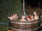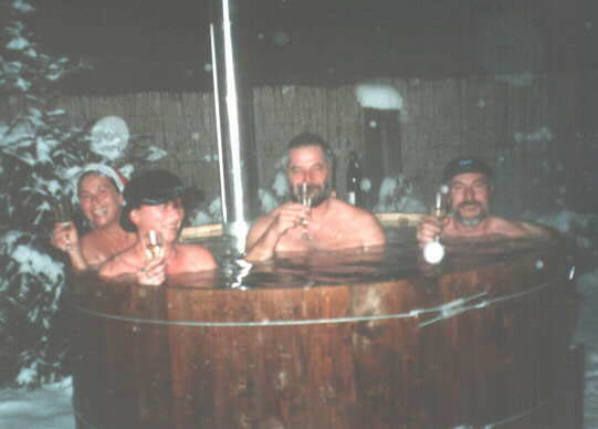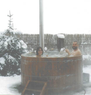 Der Zuber hat uns und auch unseren Freunden sehr gut gefallen. So haben wir richtig zugelangt und uns einen aus massivem Eichenholz gebaut. Auch “mußten” wir einige für unsere Freunde bauen. Mittlerweilen haben wir etwas Übung und wir können Funktionalität und Haltbarkeit garantieren. Wenn Ihr das Bild anklickt erscheinen einige Details unsers 2 Meter Zubers. Man kann mit 6-8 Leuten da schön Party machen. Das “Schönste” ist auf dem Rücken liegend, frei schwebend im Wasser Sternschnuppen gucken ;-)) ! Der Zuber im Januar 2003 bei minus 20 Grad.