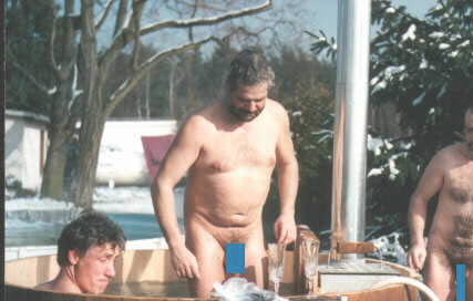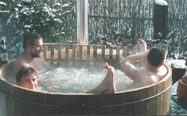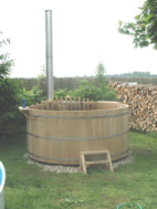 Unser erster Versuch. Der Zuber war aus Kiefernholz vom Bauhof hergestellt. Das teuerste war die fachmännische Bearbeitung der einzelnen Bretter. Die Spanngurte waren Rundeisen mit angeschweißtem Gewinde. Der Ofen wurde nach langem Tüfteln und mehreren Versuchen aus Stahlblech geschweißt, danach im Tauchbad verzinkt. Den Ofen in den Zuber gestellt, Wasser eingefüllt, angeheizt, fertig war das Bad im Freien ! Das dann so viel Schnee lag, war besonders schööön. Geheizt wird mit trockenem Holz. Das dauert ca. 2,5 Stunden (von 8 Grad auf 38 Grad). Im Zuber waren ca. 1.700 Liter Wasser. Zum Erwärmen dieser Menge benötigte man eine Schubkarre voll Holz.