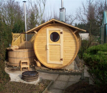 Diese selber gebaute Faßsauna ergänzt den Wellnessbereich bei Lothar! (links ist der Zuber)